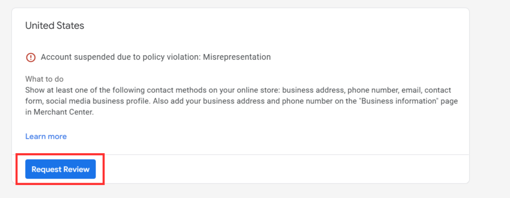 - Submit your appeal through Merchant Center: Go to “Account Issues” > “Request Review”.